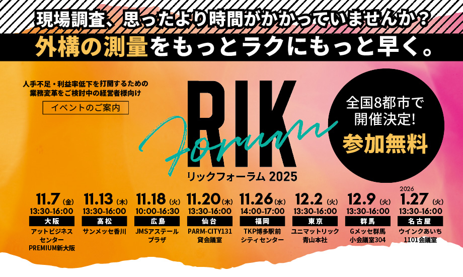 外構・造園・リフォーム・住宅分野に携わる皆さまの“現場DX”をテーマに、全国8都市でリアルイベント「RIKフォーラム2025」を開催します。