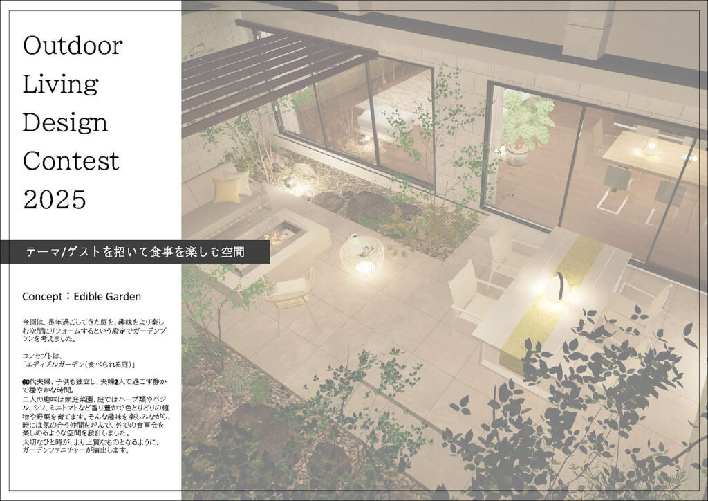 受賞作品タイトルは 「Edible Garden(エディブルガーデン)」。 コンテストのテーマは「ゲストを招いて食事を楽しむ空間」。