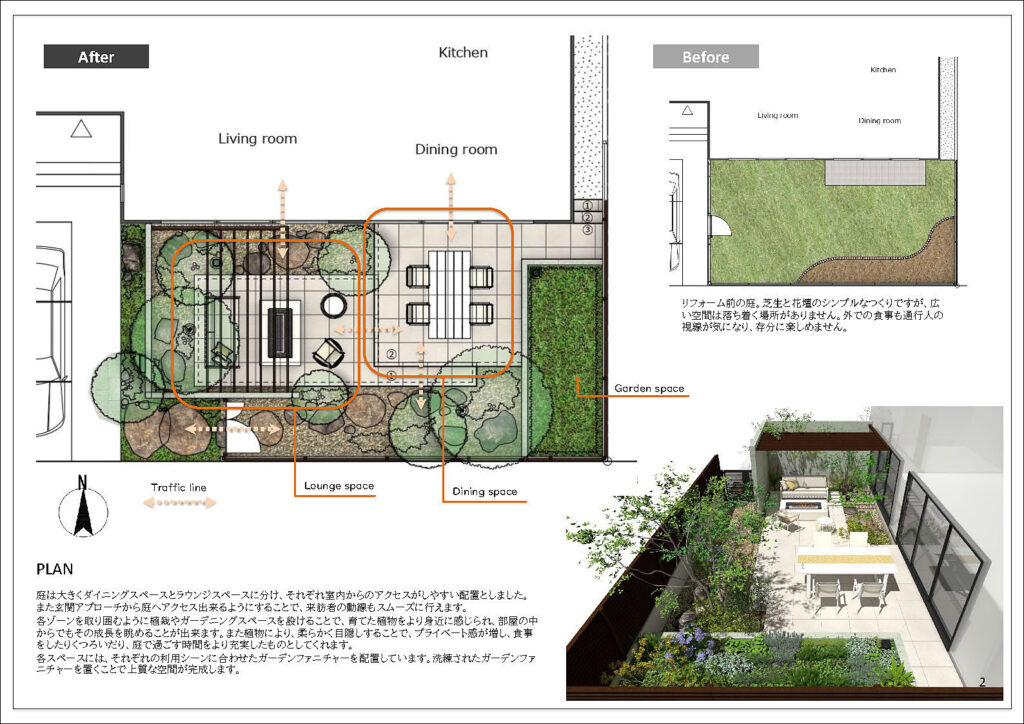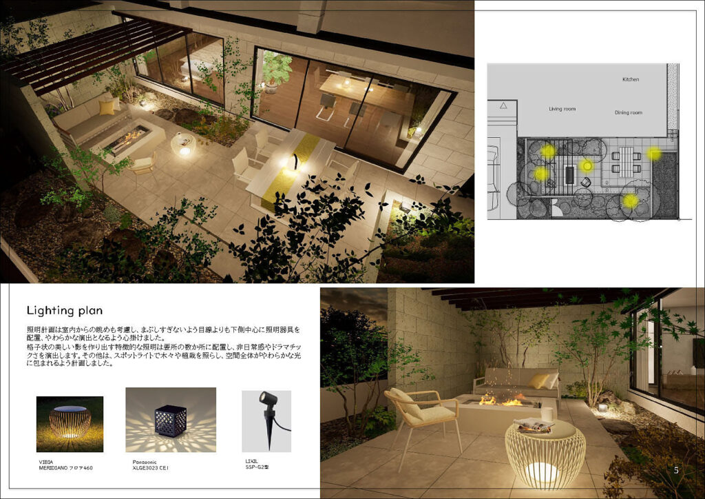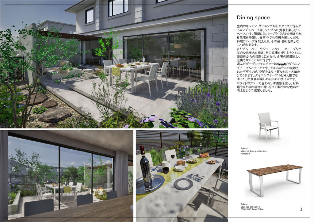 子育てを終えた60代夫婦が主役のプランです。家庭菜園が趣味の二人のために、ハーブや野菜を育てながら、気の合う仲間を招いて屋外での食事会を楽しめる庭空間をデザインしました。庭はダイニングスペースとラウンジスペースに大きく分け、それぞれ室内からスムーズにアクセスできる配置を採用。植栽でゾーンを囲むことでプライベート感を確保しつつ、育てた植物を日常的に身近に感じられる設計としています。洗練されたガーデンファニチャーが大切なひと時をより上質なものへと演出します。
