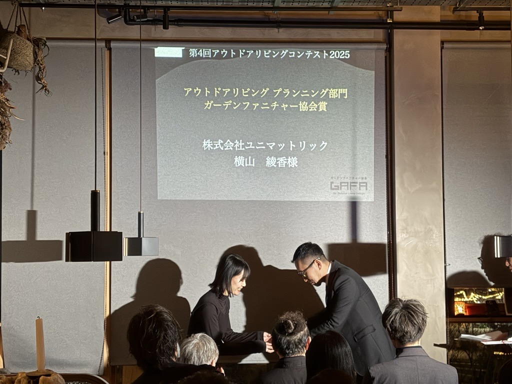 2026年2月4日に開催されたガーデンファニチャー協会(GAFA)主催「アウトドアリビングデザインコンテスト2025」の表彰式において、当社 株式会社ユニマットリック セールスグループ デザインサービスユニット チーフ 横山綾香 が、プランニング部門 ガーデンファニチャー協会賞 を受賞しました。